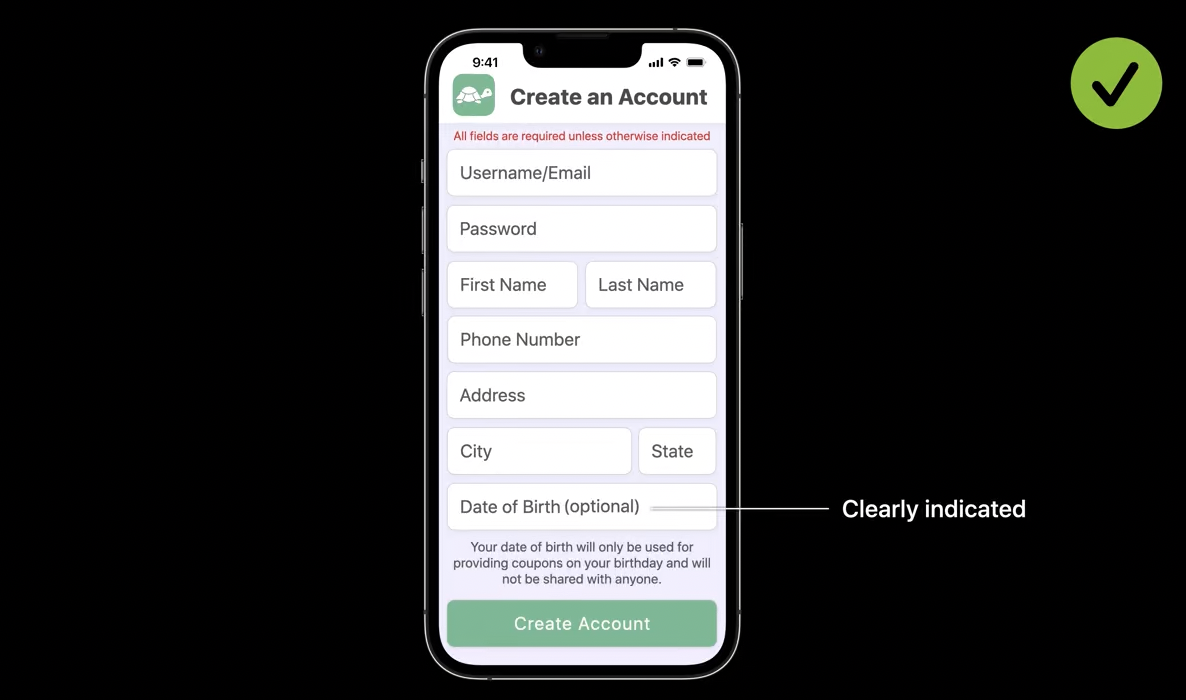 만일 반드시 들어가야 한다면 이 필드는 선택 사항임을 명확히 표시해야 합니다. 추가로 생일에 관한 정보가 필요한 이유까지 적으면 사용자의 이해를 도울 수 있습니다.