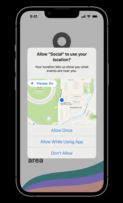 일부 앱의 경우 위치 데이터가 필요한 기능은 몇 안 됩니다 앱 실행 시 위치 권한을 요청하는 대신 앱 환경에 '현재 위치 공유' 버튼을 바로 추가하는 것을 고려해 보세요 사용자가 이 버튼을 탭하면 앱에서 '한 번 허용'과 같이 해당 세션의 사용자 위치에 대한 접근 권한을 받게 되고 이 권한은 사용자가 앱을 종료할 때까지 유지됩니다 이 경우 사용자가 앱을 사용할 때 데이터 공유 부담을 덜어줍니다