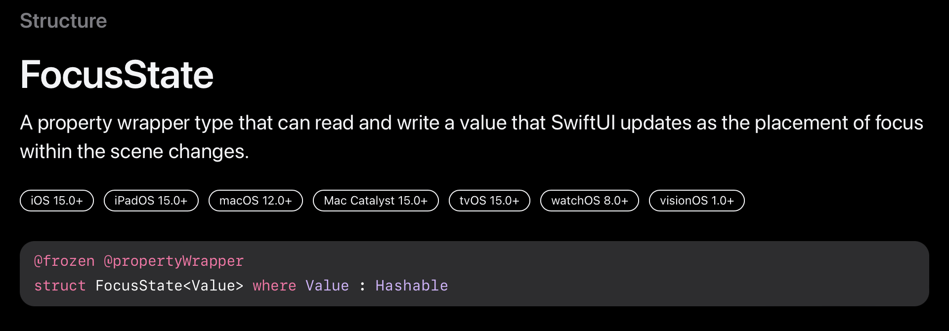 만약 Button을 만들어 @FocusState의 값을 변경하는 코드를 작성하게 된다면 버튼을 클릭하였을 때 해당 @FocusState 프로퍼티를 focused 인자로 받는 TextField의 키보드를 올리며 입력 상태로 만듭니다.