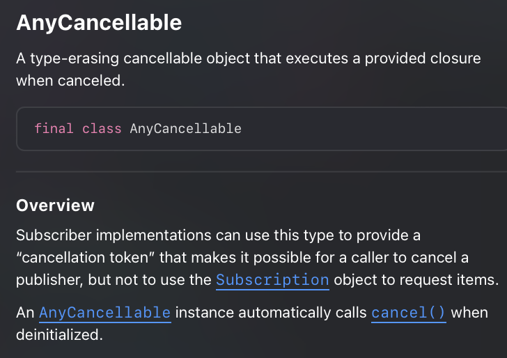 간단히 말해 publisher의 publish를 취소할 수 있도록 해주는 Combine 라이브러리에서 제공하는 타입입니다.