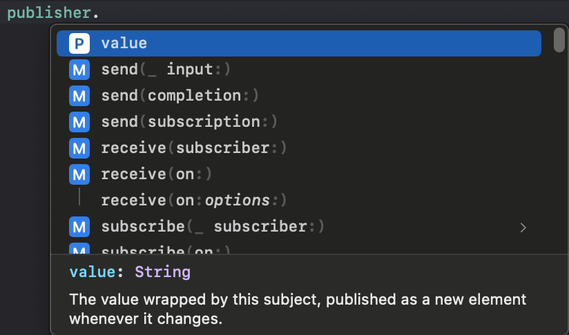 publisher는 말 그대로 publish(출판,계시)하다는 의미며 publisher가 publish 한 이벤트, 값을 subscribe(구독)하여 값의 변화를 인지하고 대응할 수 있게 합니다. 이 publish 와 subscriber 가 Combine의 핵심입니다.
