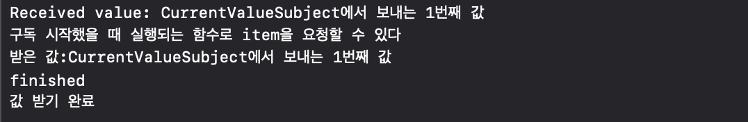 아래 결과에서 나온 결과를 확인한 후 CurrentValueSubject Publisher을 Subscribe를 했을 때에는 receive(completion:)이 실행되지 않는 것을 확인할 수 있습니다.