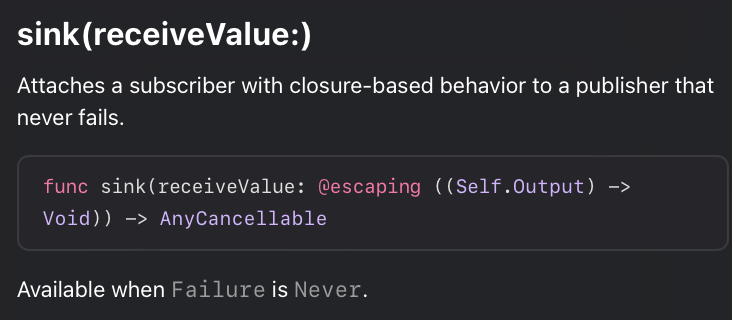 sink(receiveValue:)는 반환값으로 AnyCancellable 를 반환하는데 이 AnyCancellable은 여러개의 구독을 한꺼번에 묶어거나 취소하여 관리할 수 있습니다. 이 메서드는 Publisher의 Failure 가 Never인 경우에만 사용 가능합니다. 즉 실패를 확실히 안할 때 사용합니다.