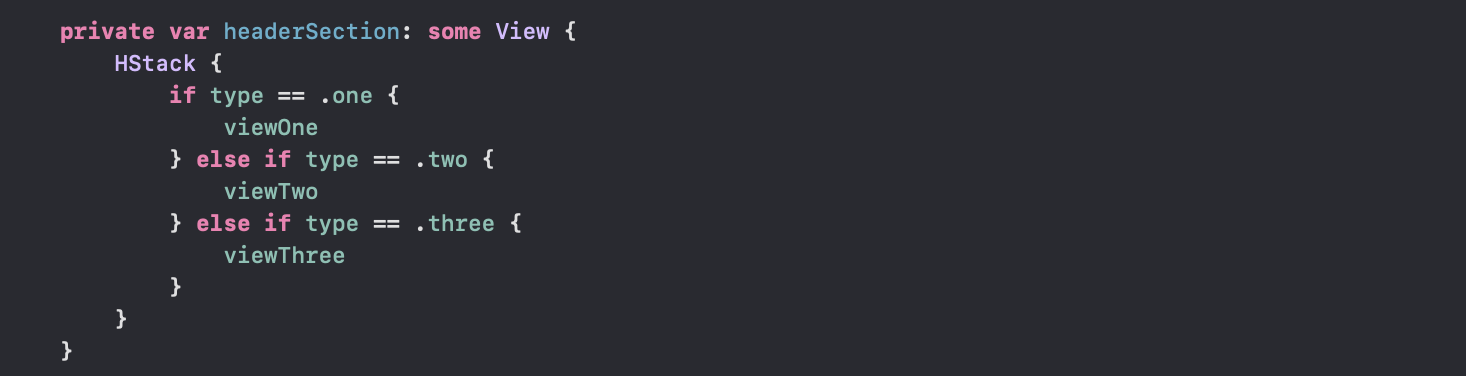 첫 번째 해결 방법에서는 HStack 같은 @ViewBuilder를 사용하여 반환받는 some View를 사용하였는데 headerSection 자체를 @ViewBuilder를 만들게 되면 해결할 수 있습니다.