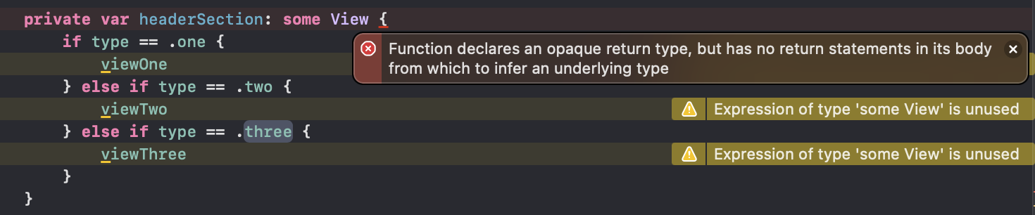 Expression of type 'some View' is unused 에러가 발생합니다. 이것은 viewOne, viewTwo, viewThree 에서 some View를 반환하는데 이 반환되는 뷰가 사용되지 않았다는 것을 의미합니다.