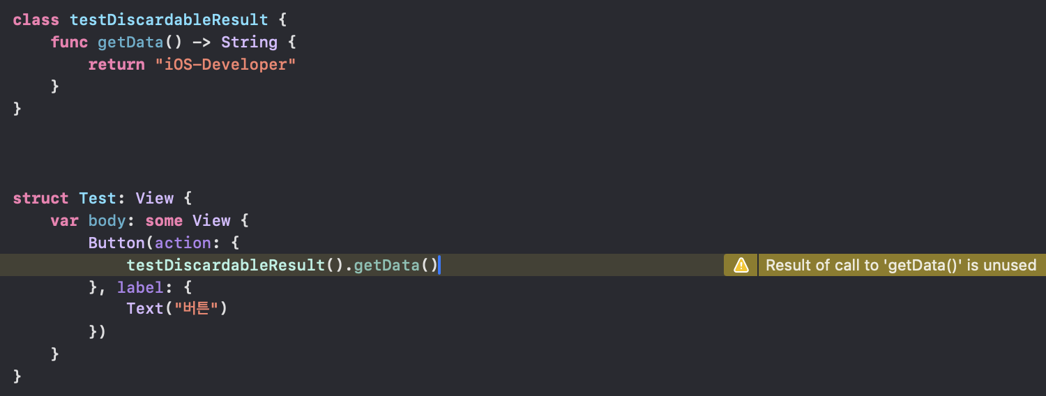 하지만 @discardableResult 를 사용하게 된다면 에러를 무시할 수 있으며 이것은 메서드로부터 반환되는 값을 무시할 수 있음을 나타냅니다.