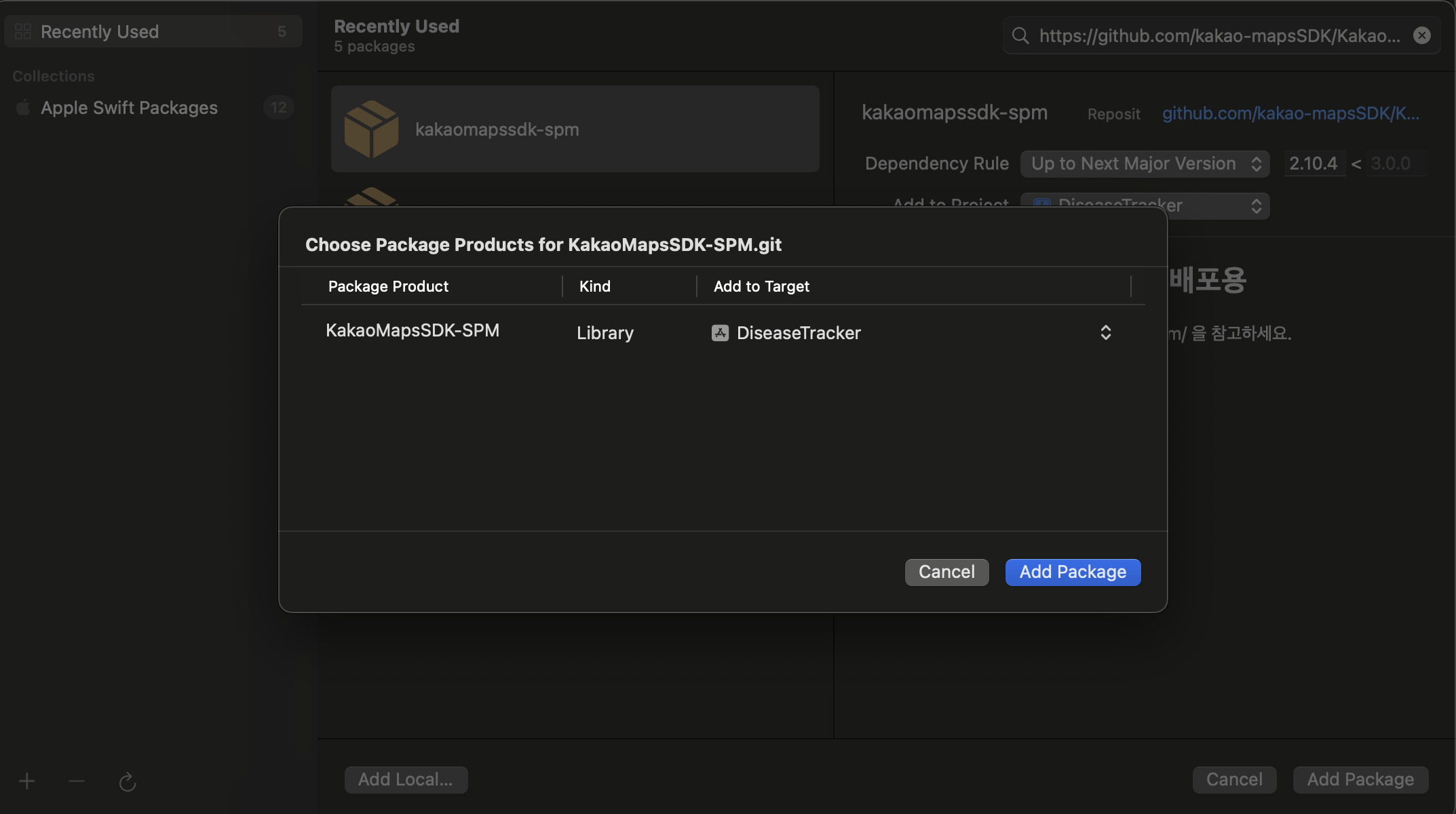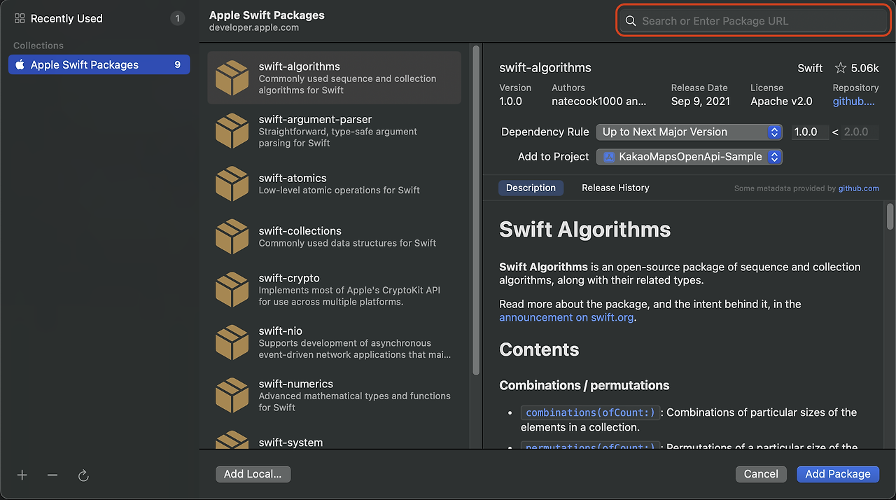 https://github.com/kakao-mapsSDK/KakaoMapsSDK-SPM.git 링크를 위에 SearchBar에 입력하여 SPM을 프로젝트에 추가해줍니다.