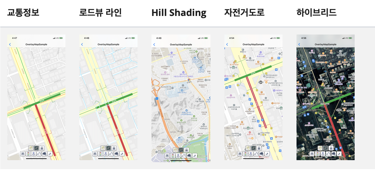 mapView.showOverlay("traffic_info")예를 들어, 스카이뷰를 baseMap으로 표시하면서 하이브리드를 함께 표시하려면 하이브리드 오버레이를 켜주면 됩니다.