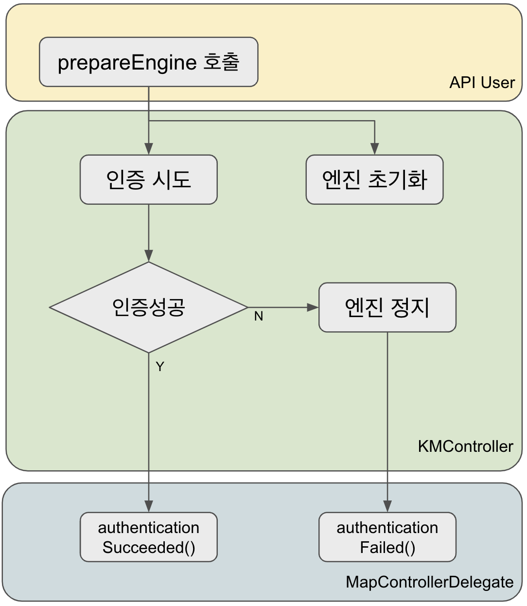 prepareEngine을 호출하면 엔진 준비 작업이 진행되고 완료되면 엔진 대기 상태가 됩니다. 이때 SDK가 인증되지 않은 상태면 백그라운드에서 인증을 진행합니다. 인증이 실패하면 엔진이 강제로 종료되어 초기 상태로 돌아가고 authenticationFailed delegate가 호출됩니다.