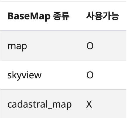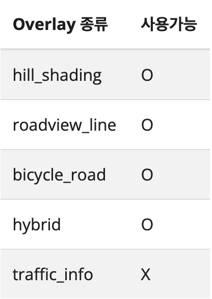 App 에 따라 사용할 수 있는 baseMap 및 overlay 의 종류가 정해져 있습니다. 아래는 app 에 상관없이 일반적으로 사용 가능 여부를 표로 나타낸 것입니다.