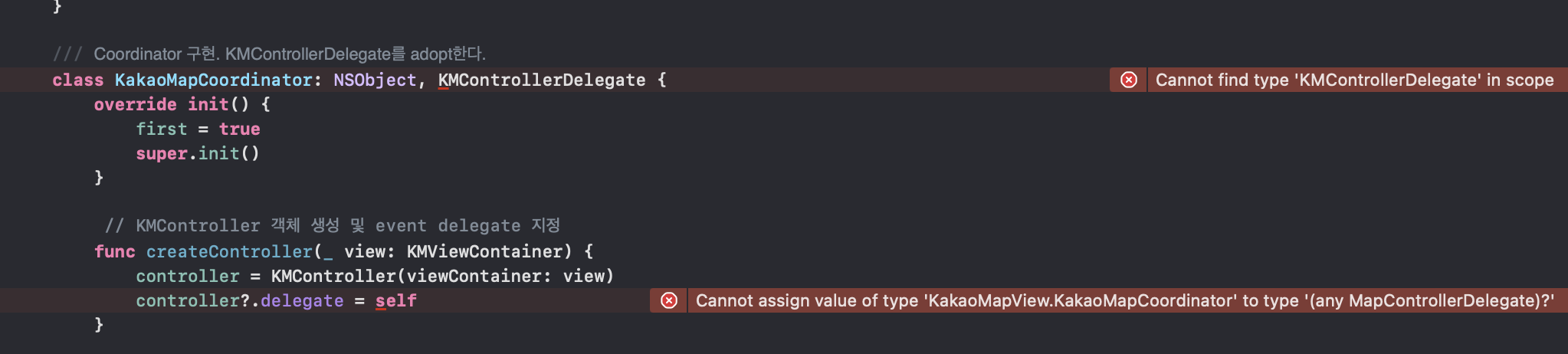 코드를 적용시키는 도중 아래와 같은 에러를 확인하게 되었습니다. 카카오에서 KMController는 만들었으면서 KMControllerDelegate를 만들어놓지 않았다는 것을 확인할 수 있었으며 조금 더 찾아본 결과 카카오에서는 그다지 SwiftUI를 완벽히 지원하지 않아 기다려야할 것 같습니다.