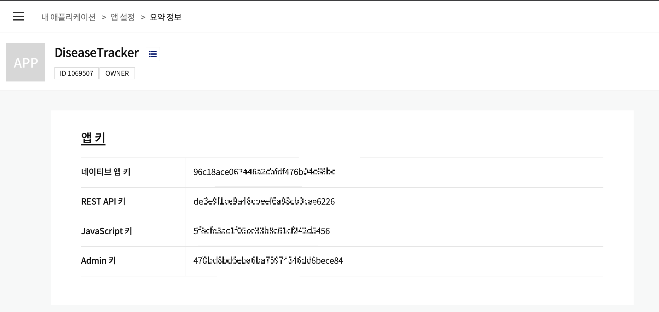 위에 단계를 거쳐 애플리케이션을 생성하였다면 다음과 같이 API를 요청할 때 사용되는 Key를 발급받았음을 확인할 수 있습니다.