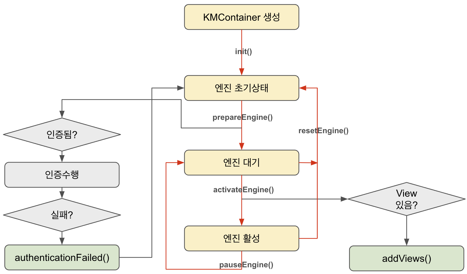 사용자는 KMController의 인터페이스를 통해 엔진의 상태를 관리해야 합니다. 아래 그림은 KakaoMapsSDK의 Life Cycle 및 상태 전이 과정을 나타낸 것입니다. 노란색 사각형은 각각 엔진의 상태를 의미하며, 녹색 사각형은 delegate로 사용자에게 전달되는 부분을 의미합니다. 빨간색 화살표는 사용자의 함수 호출에 의한 상태 전이를 나타내며, 검은색 화살표는 내부적으로 상태 전이에 따라 자동적으로 진행되는 부가 과정을 나타냅니다.