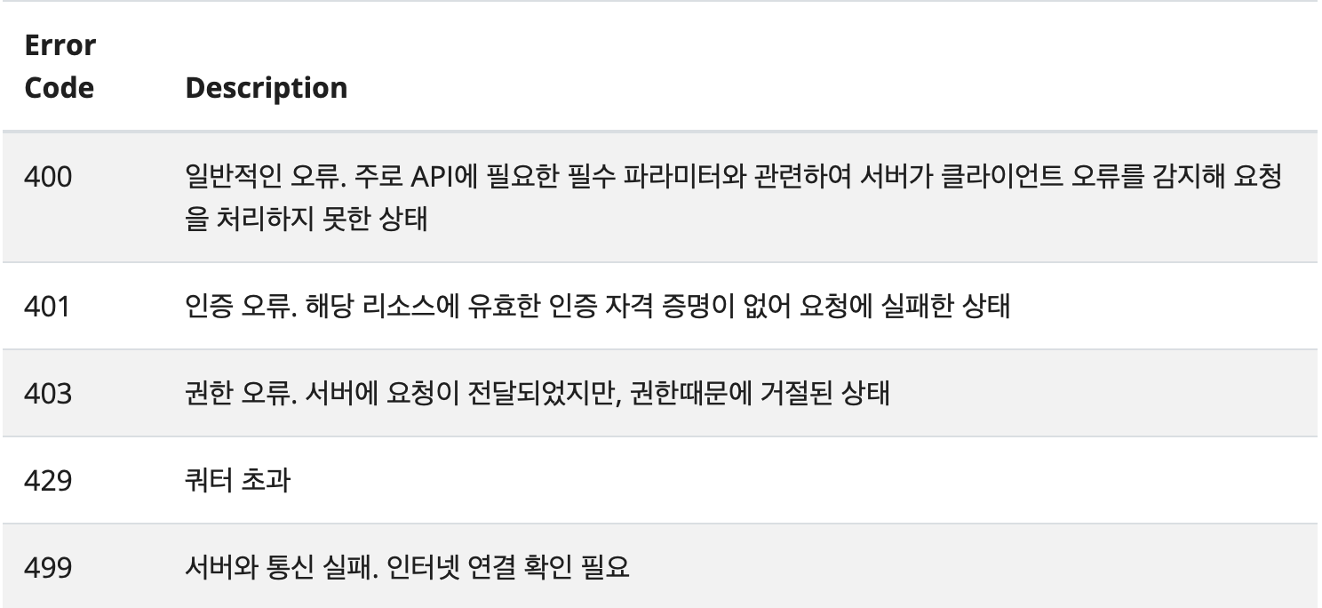 인증 실패 시의 에러코드는 아래와 같습니다.