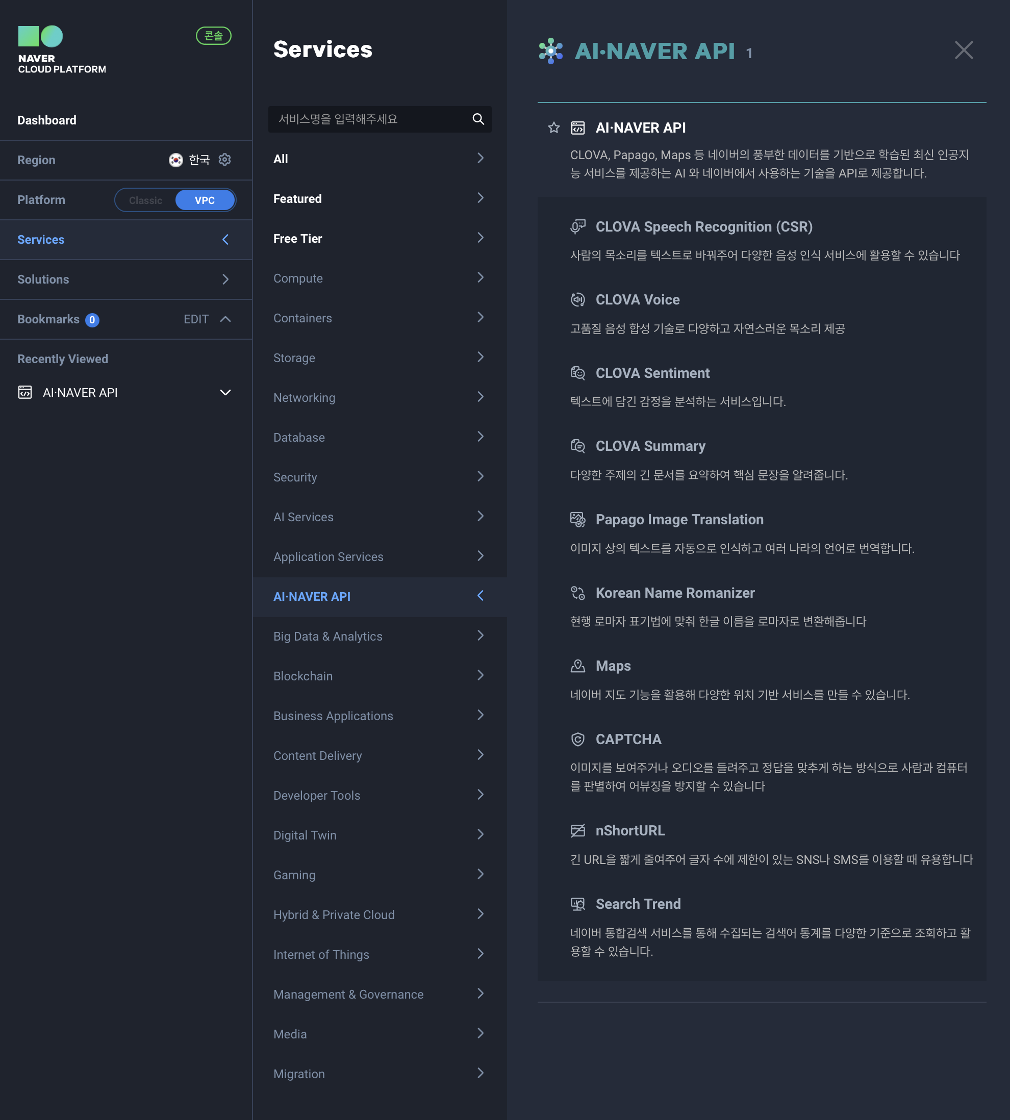 2. Products & Services에서 AI-Application Service 하위의 AI·NAVER API를 선택합니다.