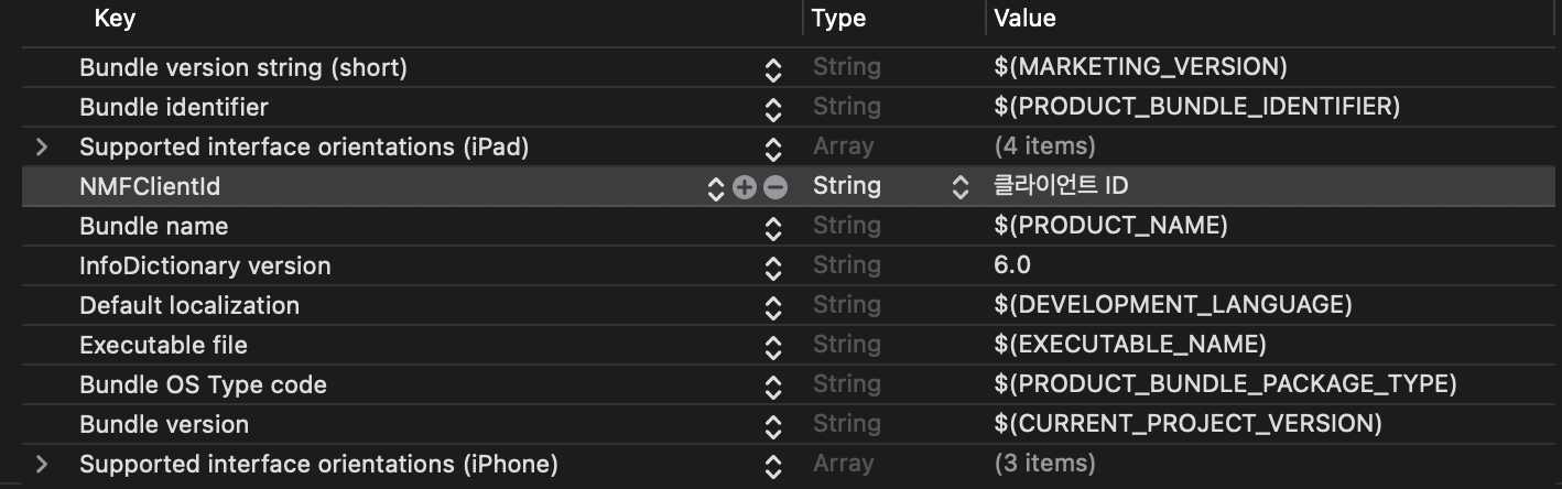 info.plist의 Custom Keys로 클라이언트 ID를 지정할 수 있습니다. info.plist에 새로운 요소를 추가하고, key로 NMFClientId를, string으로 API 키를 지정합니다.