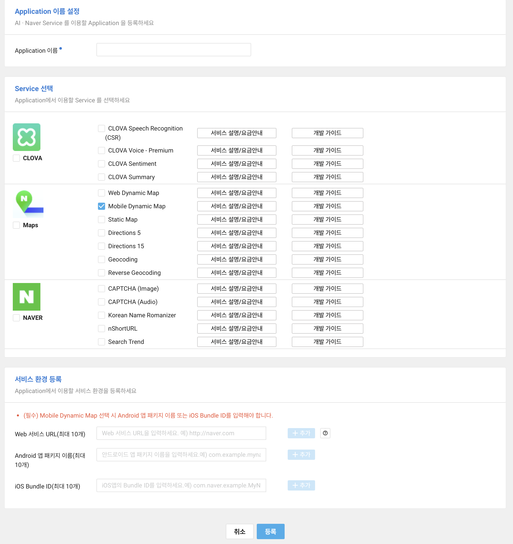 네이버 지도 모바일 SDK를 사용하려면 다음과 같이 애플리케이션을 등록하고 클라이언트 ID를 발급받아야 합니다.