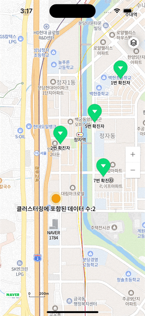 마찬가지로 클러스터링된 마커 또한 같은 로직으로 구현하면 됩니다.