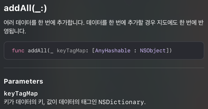 클러스터링을 할 때 위에서 만들어진 딕셔너리 배열 값을 받는 addAll이라는 메서드를 사용하였습니다. 이 메서드는 여러 데이터를 한 번에 추가하며 [key : tag] 처럼 데이터의 키는 key, 값은 tag로 저장되어 있음을 알 수 있습니다.