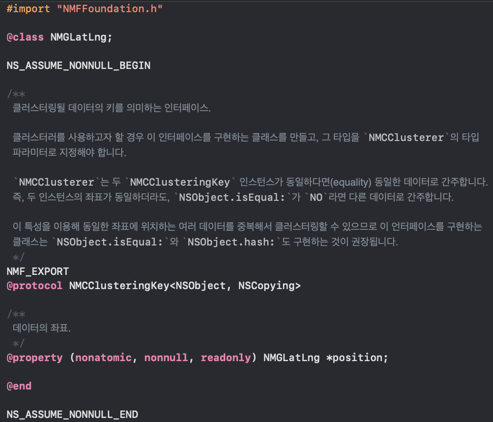 여기서 클러스터링을 하기 위해서는 클래스가 NMCClusteringKey 프로토콜을 준수해야 하는데 이 프로토콜을 좀 더 알아보겠습니다.