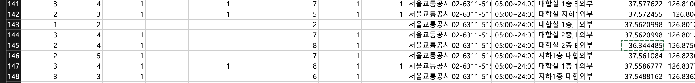 추가로 데이터를 분석해보면 145번째 행에 위치는 서울이지만 위도가 36인 outlier 가 존재합니다. 해당 데이터를 37로 수정해줍니다.