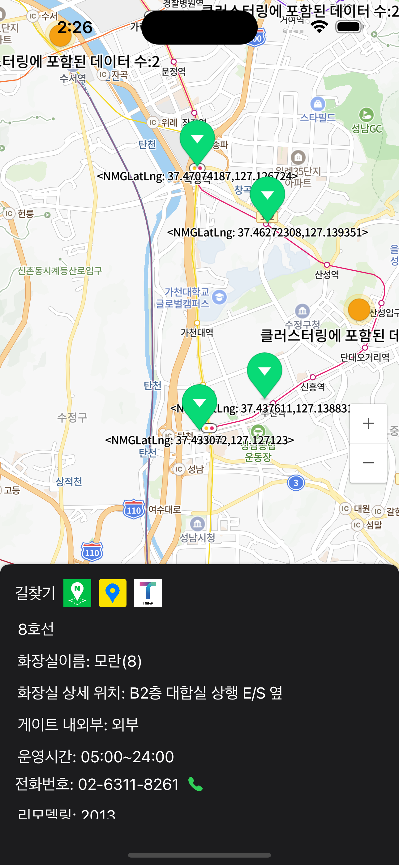 이제 마커를 이용하여 사용자한테 화장실에 위치,정보를 알려주는 코드를 작성해보겠습니다. 아래 코드는 클러스터링 작업을 수행하여 마커를 표시하는 코드입니다.