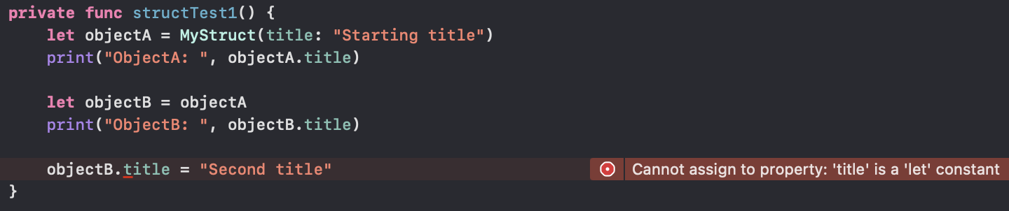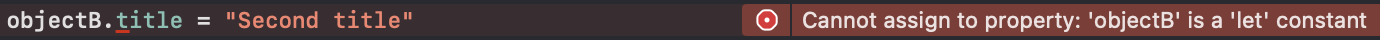 하지만 이때 objectB 인스턴스의 title을 바꾸려고 시도하면 struct의 title을 let 에서 var로 바꿔야 한다는 에러 발생합니다.