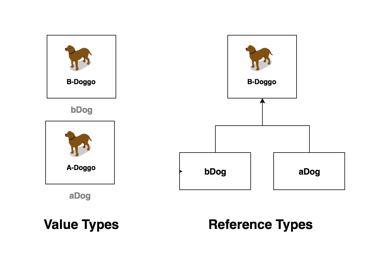 아래 사진에서 B-Doggo는 Heap에 저장되어 있으며 bDog와 aDog는 힙에 저장된 B-Doggo 인스턴스의 값을 포인터로 참조합니다.