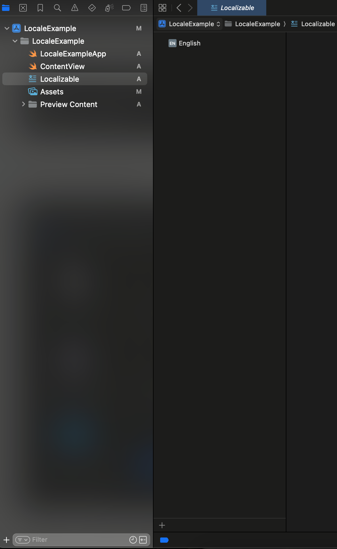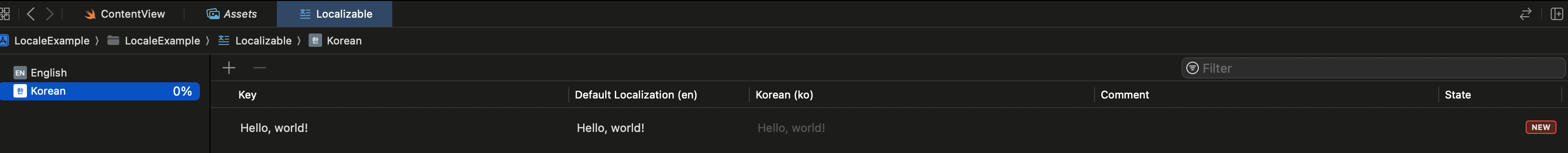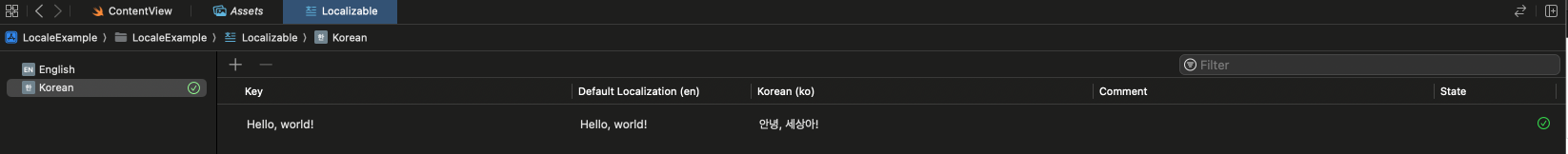추가한 후 코드를 빌드해주면 프로젝트 View에서 사용되는 문자들을 번역할 수 있도록 보여줍니다. 번역된 내용이 어느정도인지는 %로 나타내주며 모든 문자들이 번역이 된다면 ✅ 로 완료되었음을 확인할 수 있게 됩니다.