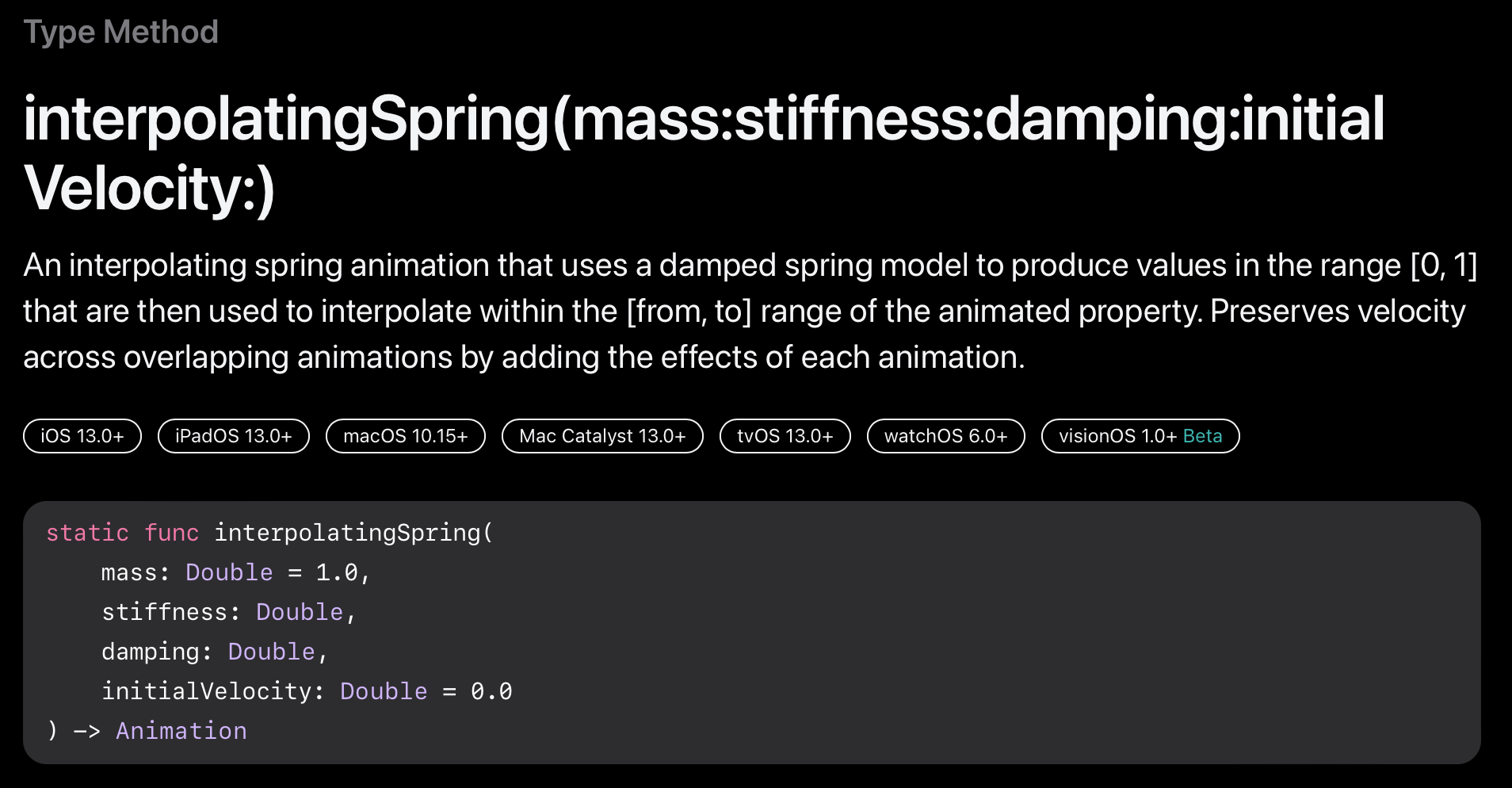 damped(감쇠된) 스프링 모델을 사용하여 애니메이션 속성의 [from, to] 범위 내에서 보간하는 데 사용되는 [0, 1] 범위의 값을 생성하는 보간 스프링 애니메이션이다. 각 애니메이션의 효과를 추가하여 겹치는 애니메이션의 속도를 유지한다.