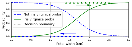 양쪽의 확률이 똑같이 50%가 되는 1.6 근방에서 결정 경계가 만들어집니다. 1.6cm보다 크면 분류기는 Iris-Verginica로 분류하고, 그보다 작으면 아니라고 예측할 것입니다. (아주 확실하지 않더라도)