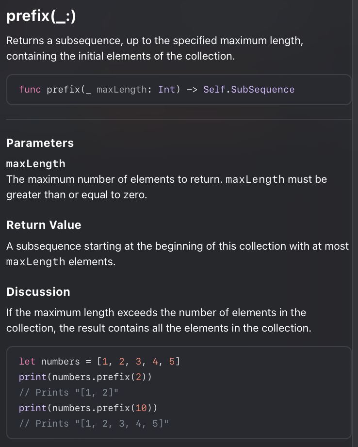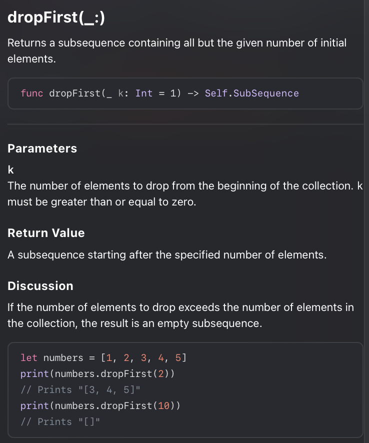 dropFirst 란 prefix와 비슷하게 특정 원소(Int로 지정) 이후의 값을 잘라냅니다.