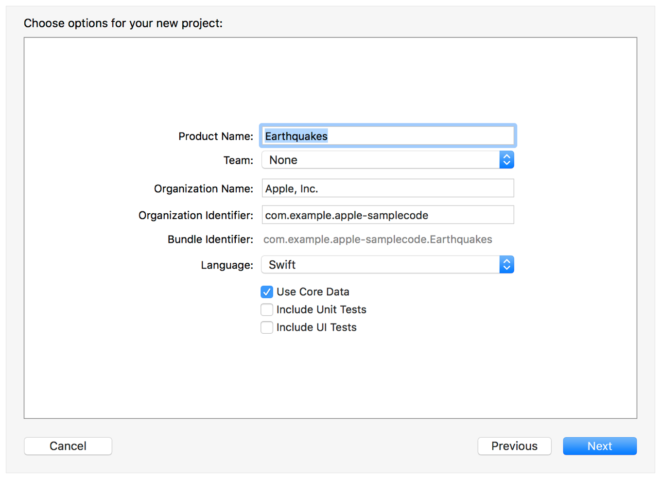 새로운 프로젝트를 만드는 대화상자에서 Use Core Data 체크박스를 클릭합니다.