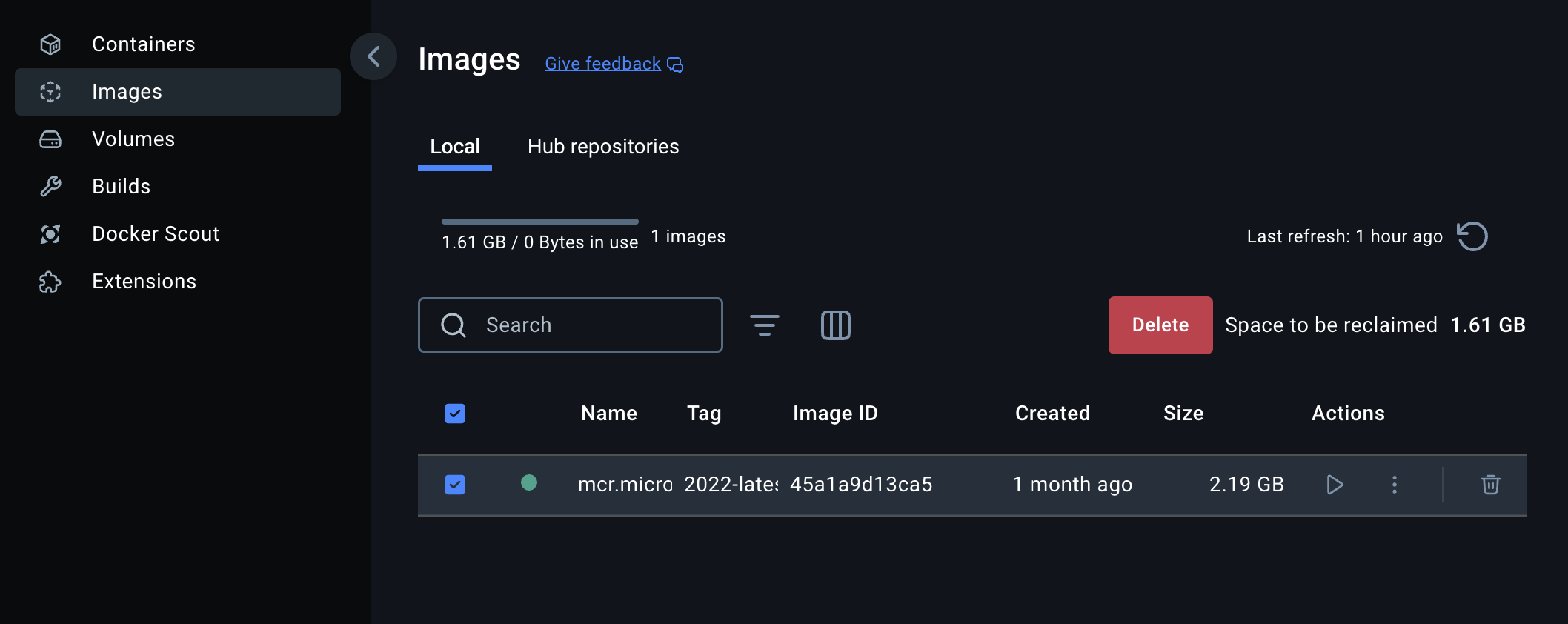 - Docker 가 SQL Server 이미지를 다운로드한 후, Docker 에서 해당 이미지가 표시됩니다.