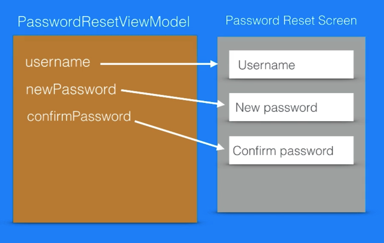 예를 들어 패스워드를 변경하는 화면이 존재한다고 했을 경우 username 과 newPassword, confirmPassword 를 가지고 있는 ViewModel 를 사용하게 되면 화면으로부터 데이터를 가져오거나 화면에 데이터를 공급해줄 수 있게 됩니다. 이것은 username은 username TextField로부터 데이터를 가져오는 것을 의미합니다. 마찬가지로 newPassword, confirmPassword도 각각의 TextField로부터 데이터를 가져올 수 있게 됩니다.