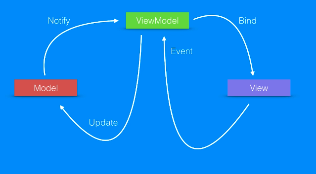 즉 Model 에서 View 에 데이터를 전달하고 싶을 경우 ViewModel 에 알림으로서 ViewModel 에 존재하는 데이터를 Bind 하여 View 에 전달합니다. 만일 View가 Model 로부터 데이터를 직접 가져올 때는 Model 에 직접 접근하지 않고 ViewModel 에 Event를 발생시키고 Model 에 접근하게됩니다