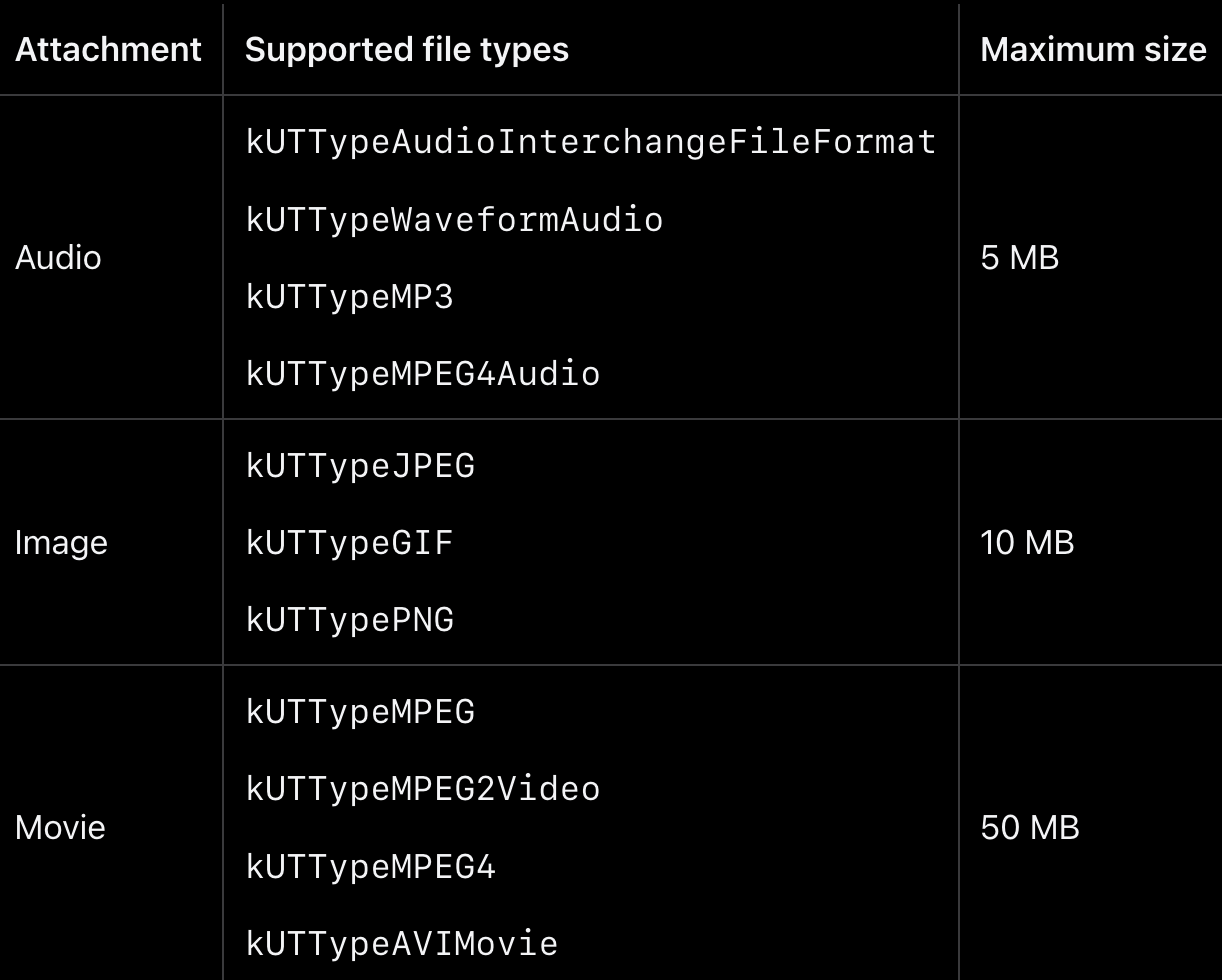 이미지를 넣어야 하는 경우 UNNotificationAttachment 를 사용해야 합니다. 이 클래스는 오디오, 이미지 또는 비디오를 알림에 추가할 수 있게 합니다. 사용하고자 하는 미디어는 반드시 디스크에 존재해야하며 지원하는 미디어 타입을 사용해야한다는 특징이 있습니다.